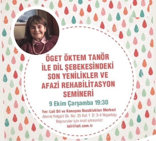 Öget Öktem Tanör ile Dil Şebekesindeki Son Yenilikler ve Afazi Rehabilitasyonu Semineri 09 Ekim 2019 Çarşamba 19:30’da Lali Dil ve Konuşma Bozuklukları Merkezi’nde.