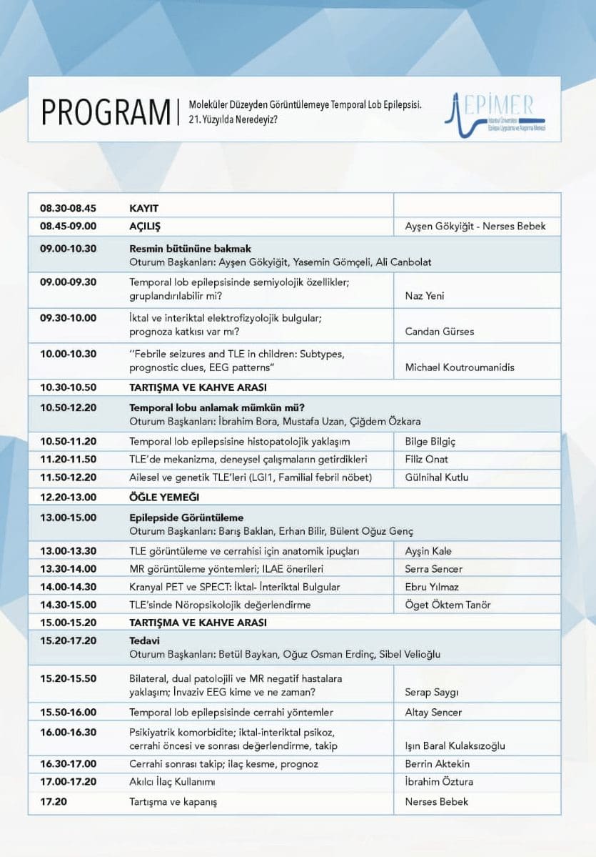 Dernek Başkanımız Sayın Prof. Dr. Öget Öktem’in konuşmacı olarak katılacağı “Temporal Lob Epilepsisinde 21. Yüzyılda Molekülerden Görüntülemeye Neredeyiz?” konulu EPİMER Sempozyumunda “Temporal Lob Epilepsisinde Nöropsikolojik Değerlendirme” adlı konuşmasını sunacaktır. Sempozyum 18 Ekim 2019 Cuma günü İstanbul Üniversitesi Fuat Sezgin Konferans salonunda yapılıyor.