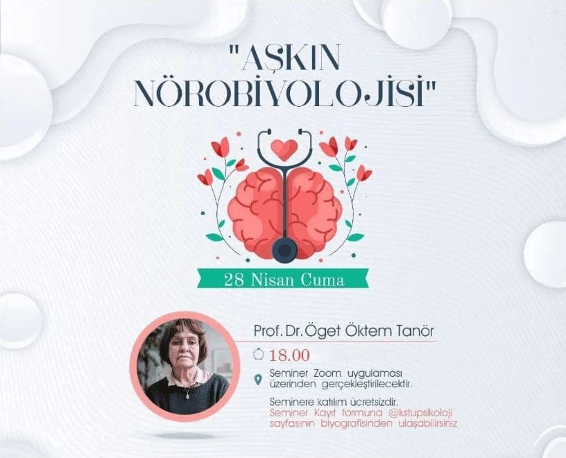 Dernek Onursal Başkanımız Sayın Prof. Dr. Öget Öktem-Tanör, Kıbrıs Sağlık ve Toplum Bilimleri Üniversitesi Psikoloji Kulübü tarafından organize edilen webinarda “Aşkın Nörobiyolojisi” başlıklı konuşmasını yapacaktır. Webinar 28 Nisan 2023 Cuma günü saat 18:00‘de Zoom üzerinden gerçekleştirilecektir.