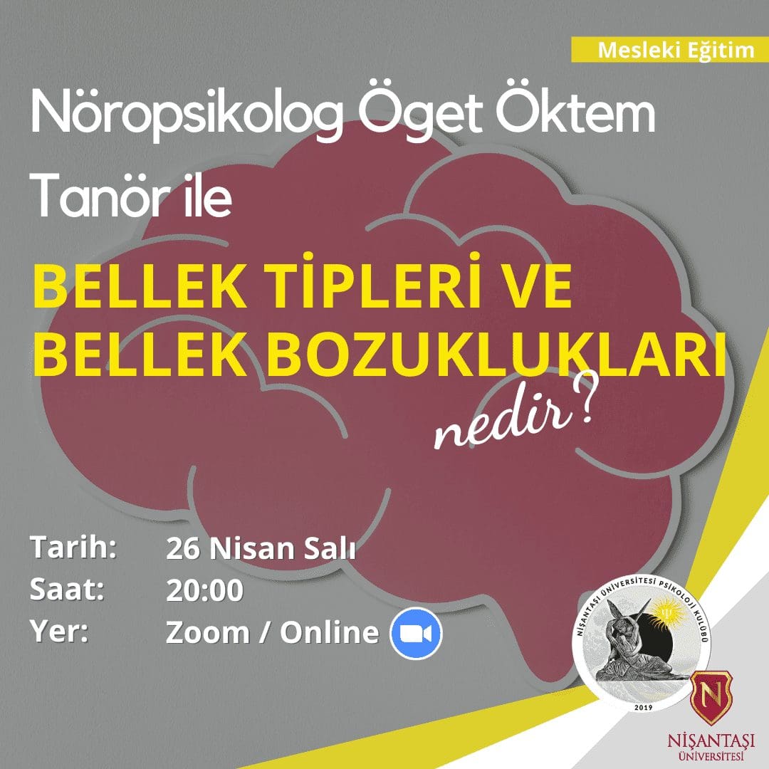 Dernek Başkanımız Sayın Prof. Dr. Öget Öktem Tanör, Nişantaşı Üniversitesi Psikoloji Kulübü tarafından organize edilen webinarda “Bellek Tipleri ve Bellek Bozulmaları” başlıklı konuşmasını yapacaktır. Program 26 Nisan 2022 salı günü saat 20:00‘de Zoom üzerinden gerçekleştirilecektir. Kontenjan sınırı vardır.