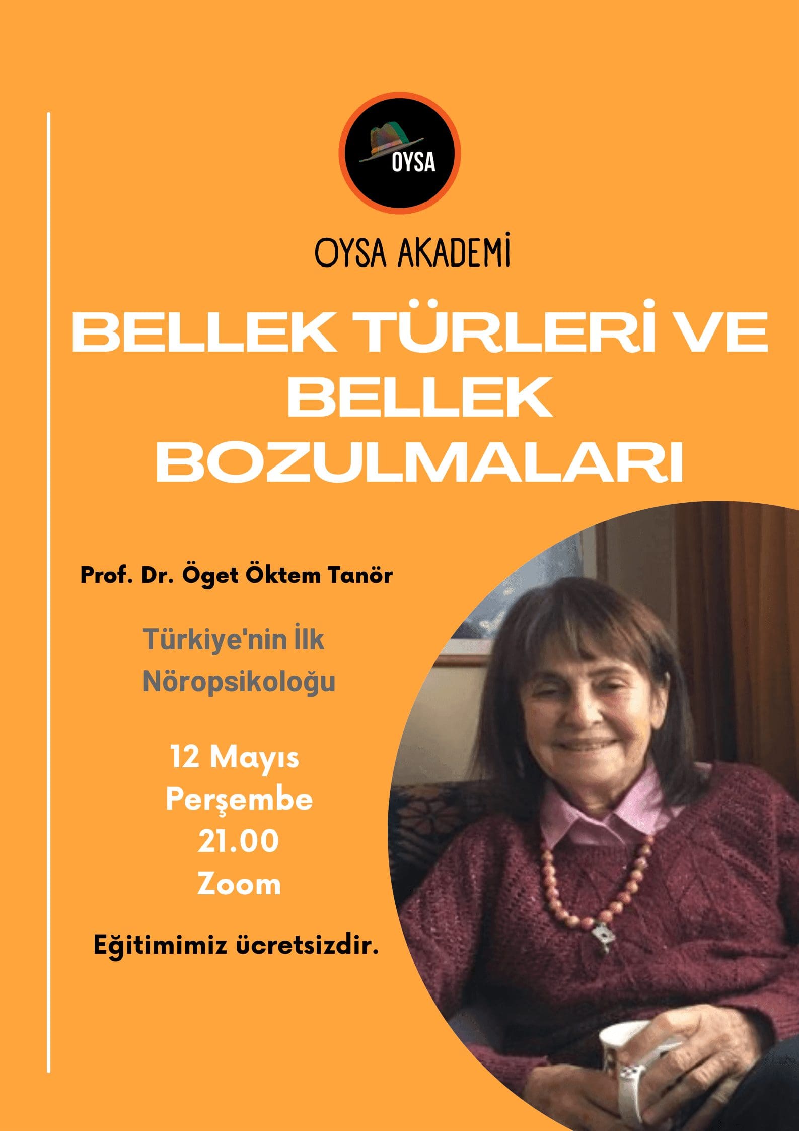 Dernek Başkanımız Sayın Prof. Dr. Öget Öktem Tanör, OYSA Akademi tarafından organize edilen webinarda “Bellek Türleri ve Bellek Bozulmaları” başlıklı konuşmasını yapacaktır. Program 12 Mayıs 2022 perşembe günü saat 21:00‘de Zoom üzerinden gerçekleştirilecektir.
