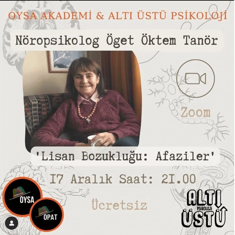 Dernek Başkanımız Sayın Prof. Dr. Öget Öktem Tanör, Altı Üstü Psikoloji & Oysa Akademi iş birliğiyle organize edilen webinarda “Lisan Bozukluğu: Afaziler” başlıklı konuşmasını yapacaktır. Program 17 Aralık 2022 cumartesi günü saat 21:00‘de Zoom üzerinden gerçekleştirilecektir.