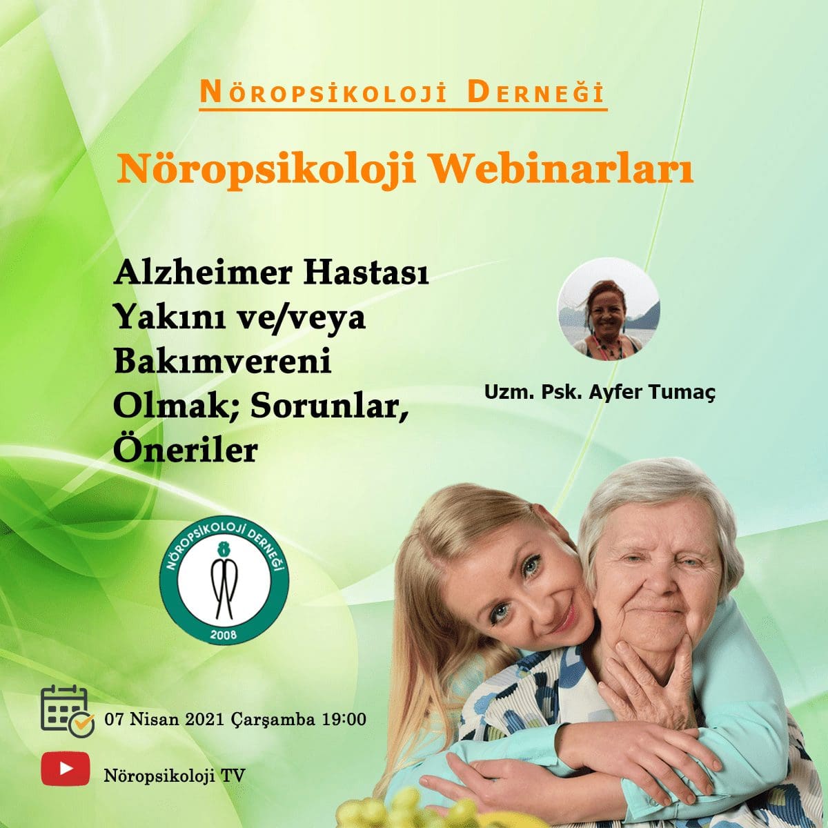 Derneğimiz tarafından organize edilen “Nöropsikoloji Webinarları”nın üçüncü programında, Sayın Uzm. Psk. Ayfer Tumaç ile “Alzheimer Hastası Yakını ve/veya Bakımvereni Olmak; Sorunlar, Öneriler” konusu ele alınıyor. Derneğin YouTube kanalı olan “Nöropsikoloji TV” üzerinden yapılacak canlı yayın 07 Nisan 2021 çarşamba günü saat 19:00‘da gerçekleştirilecektir.